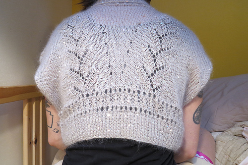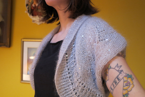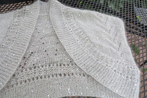 I knit it in Schulana Kid-Paillettes in #320 Silver (if this had been a gift for myself, I’d have used #380 Pale Mauve, which makes me feel totally swoony). It’s a really amazing sequined mohair blend lace weight yarn that I just can’t say enough kind things about. I highly recommend it for knitting fancy treats. For the size medium, I technically used four skeins, but I didn’t start into the fourth until just a few rows from the end.