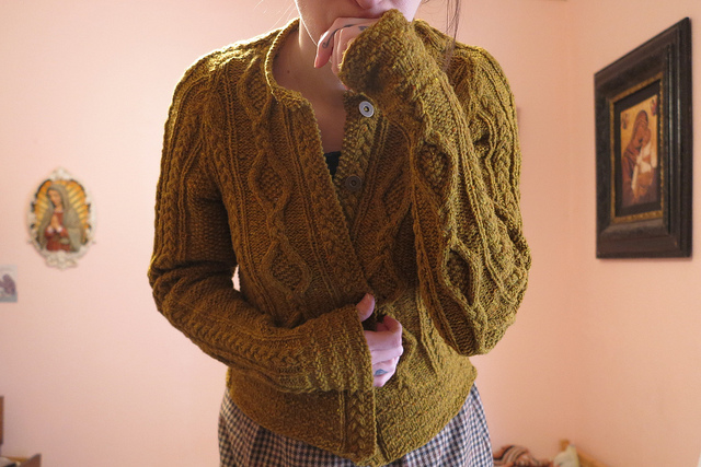 I think the only aspect of this sweater that I feel a little “eh” about is the width of the arms. I have exceptionally skinny upper arms in comparison to the rest of my body, and I usually knit my sleeves a little smaller than a pattern calls for, but I didn’t do that this time. I don’t think I regret that decision necessarily. I kind of like the boxy, old-fashioned shape of this cardigan. And the extra room in the arms makes this a nice cozy layering piece, which I think really suits it.