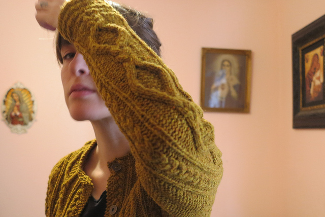Anyway, look, a sweater! I knit it, I took a picture of it, I talked about it. I am participating in the world. I had planned on *really* participating and going on a little trip this weekend, but my beloved cat was having some health problems, and was just diagnosed with asthma last night, so I’ll be spending the next few days hanging hard with her, watching a lot of movies and knitting in bed. I’m not necessarily complaining about that.