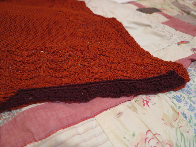 I knit those last few inches of lace edging in burgundy Brown Sheep laceweight wool. We’ll call that an accent color. It doesn’t show when the shawl is folded up and worn, but I still wouldn’t want to give a gift with a funny patch of a different color. So maybe it’s time that I embrace the occasional colorful garment, imperfect as it may be.