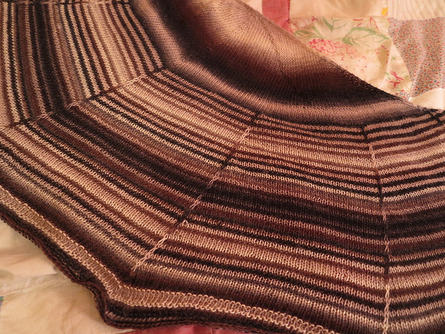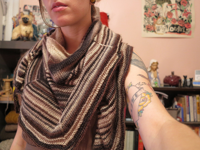 Someday I’ll probably knit this shawl again, using either two solid colors or one solid and one striping. I don’t wear as many striped things as I once did, but I’ve really come back around to them in small doses. Especially when you can get this many neutrals into one piece.