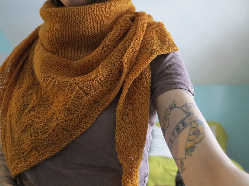 I knit the Sandness shawl as a gift for a friend who has been stressed out applying for grad school, and who loves bright, warm colors, which of course, I rarely wear myself. Deep, deep in my stash I had some Brown Sheep Nature Spun fingering weight wool (the color is Sunburst Gold). Though I had one skein less than I thought I had, so this shawl has some sizing idiosyncrasies.  I knit the center triangle for the larger shawl size, but having only two skeins of yarn instead of three, had to knit one less repeat of the edging than I’d intended. As a result, the wingspan of the finished shawl is a bit more narrow than indicated in the pattern.