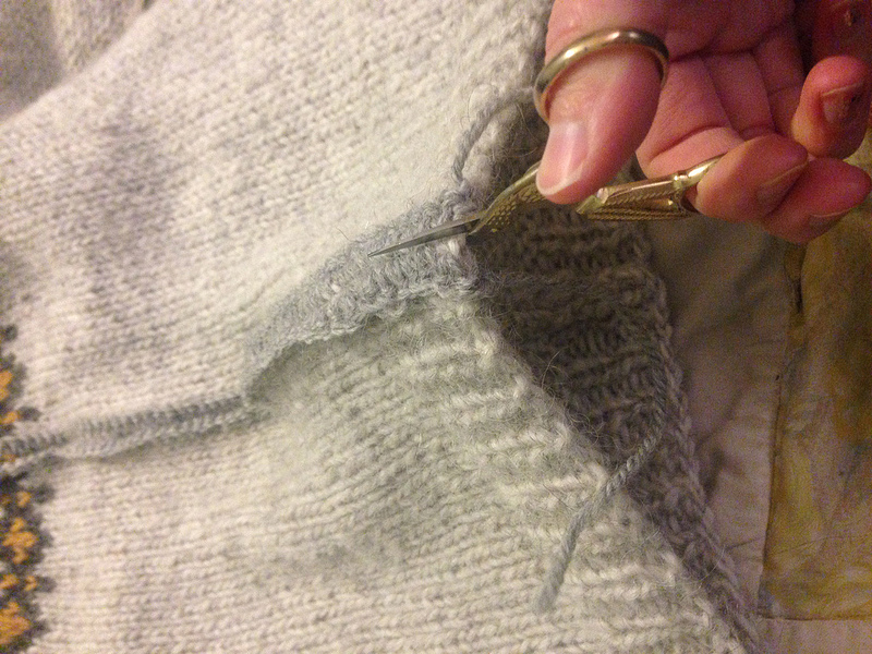 As the weather got colder, I got a lot of wear out of Hela as a pullover, and I still loved it, but in the back of my mind, I knew I would like it more as a cardigan. Had I intended it to be a pullover, I would have knit it a size larger, and added more length to the body. In a nutshell, I could tell that this sweater wanted to be a  cardigan. So not long into January, I went home from work, pulled up Kate Davies’ steek tutorial, tried it out on a practice swatch, drank a little bourbon, and cut my favorite sweater in half.